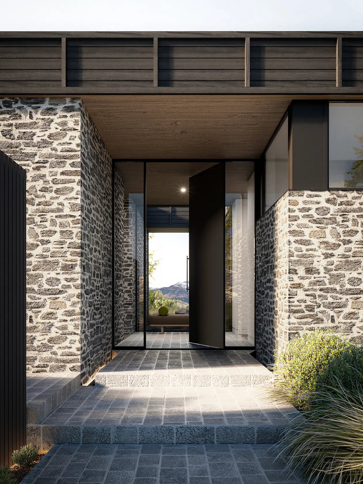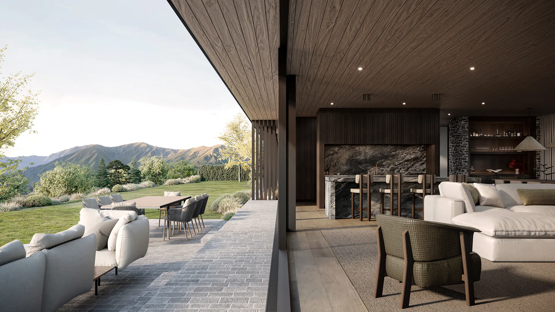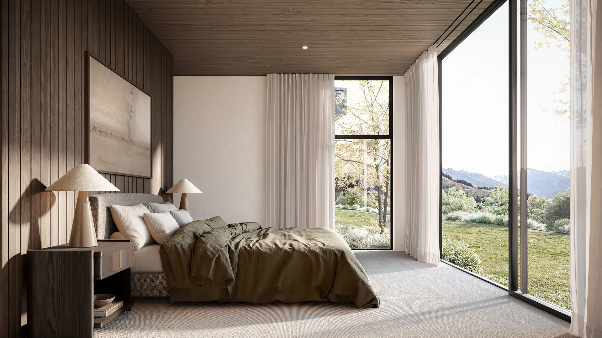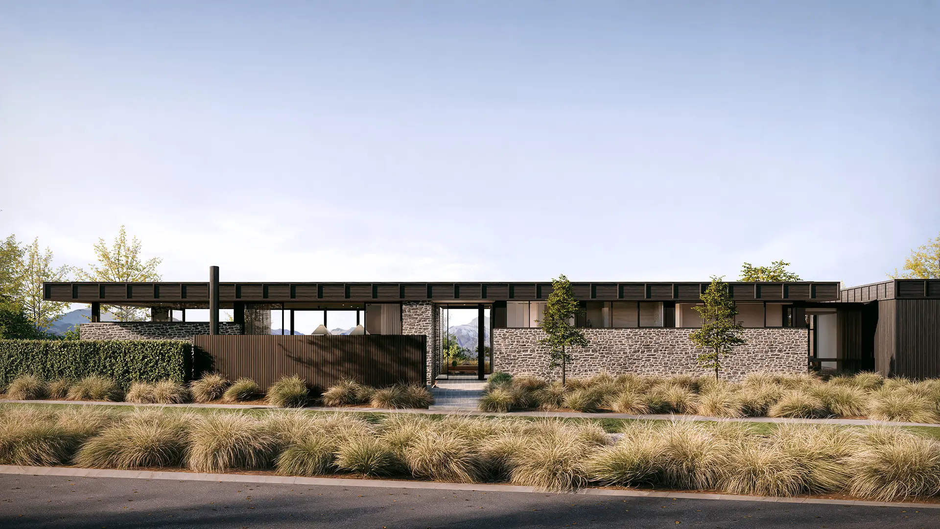 First Light is named for what you see when you wake up here. It sits at the front of Kawarau Heights on one of the estate's largest and most privately positioned sites, oriented to catch the morning across the basin before the valley fully wakes. The flat roof profile keeps the residence settled in the landscape. The full-width glazing makes the mountains part of the room.