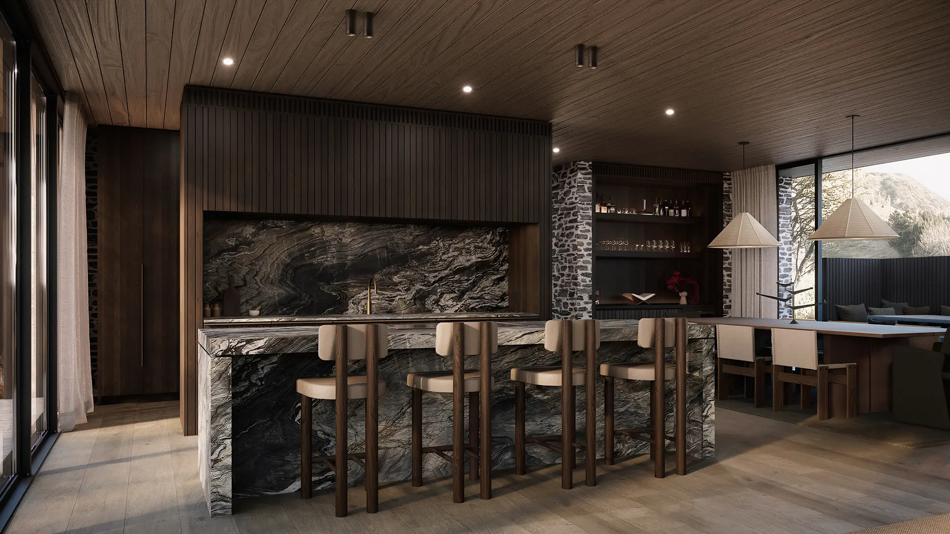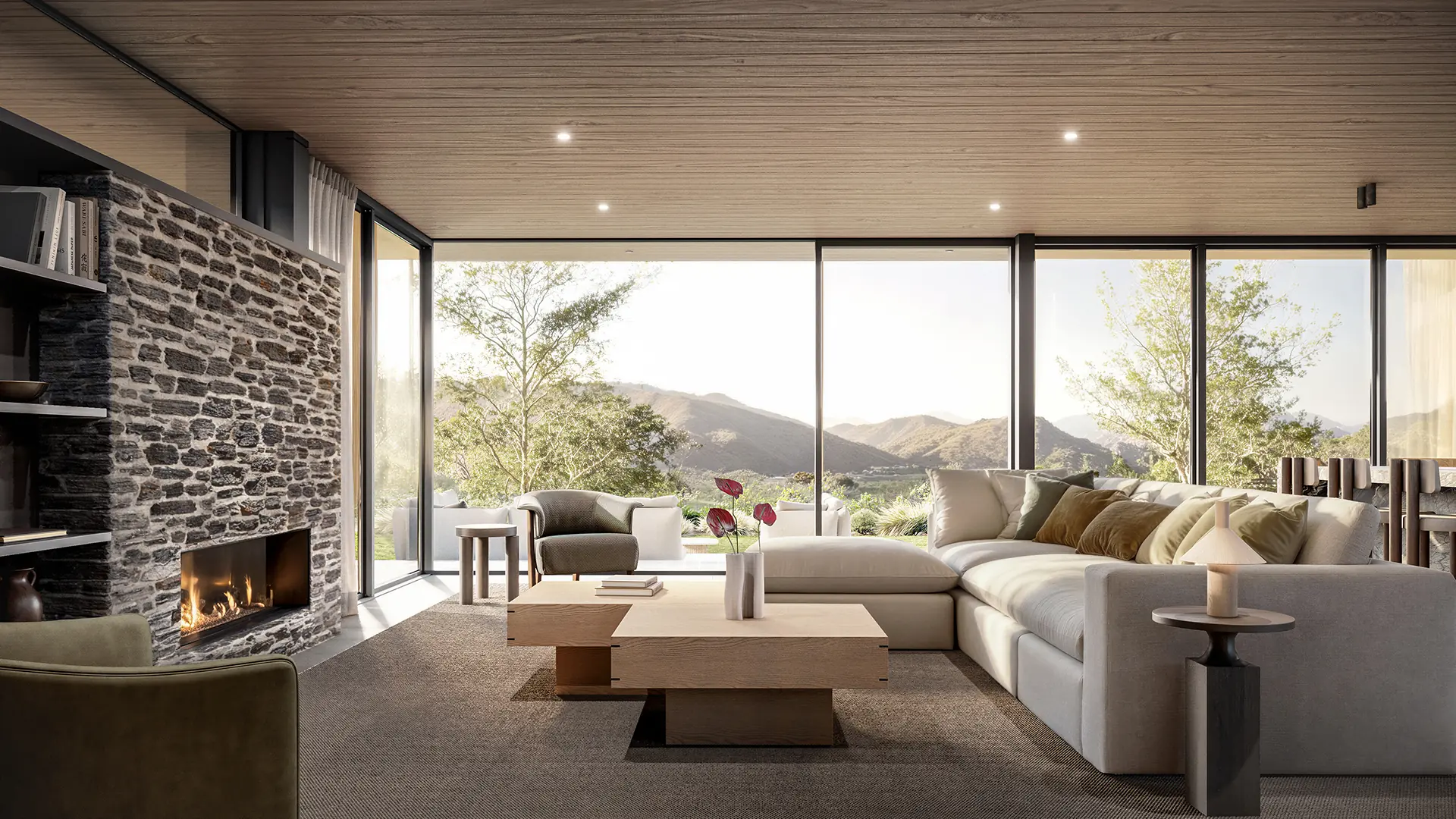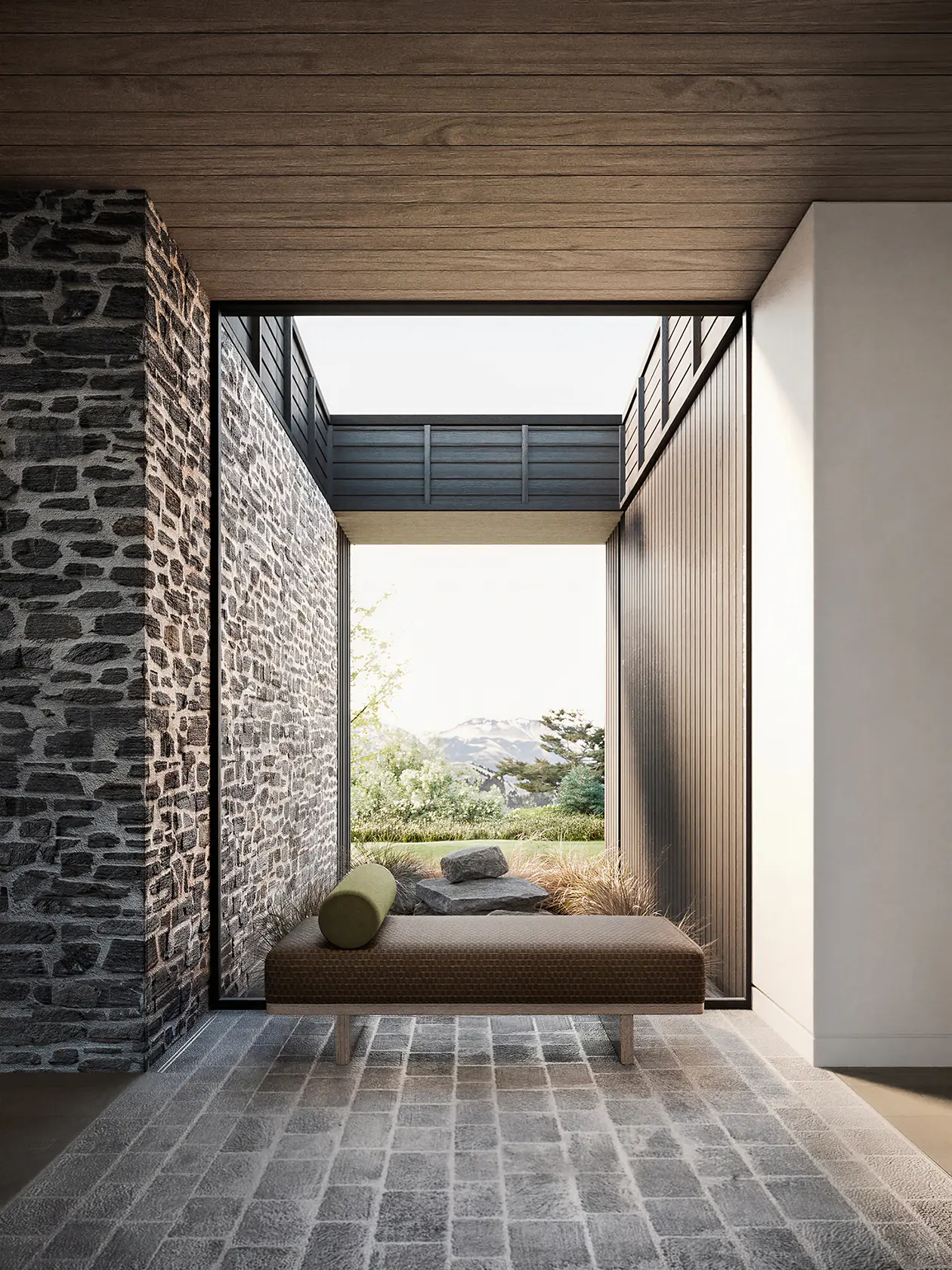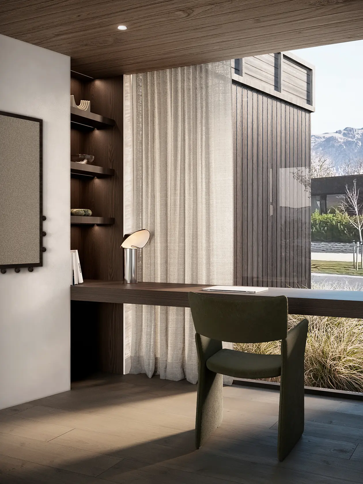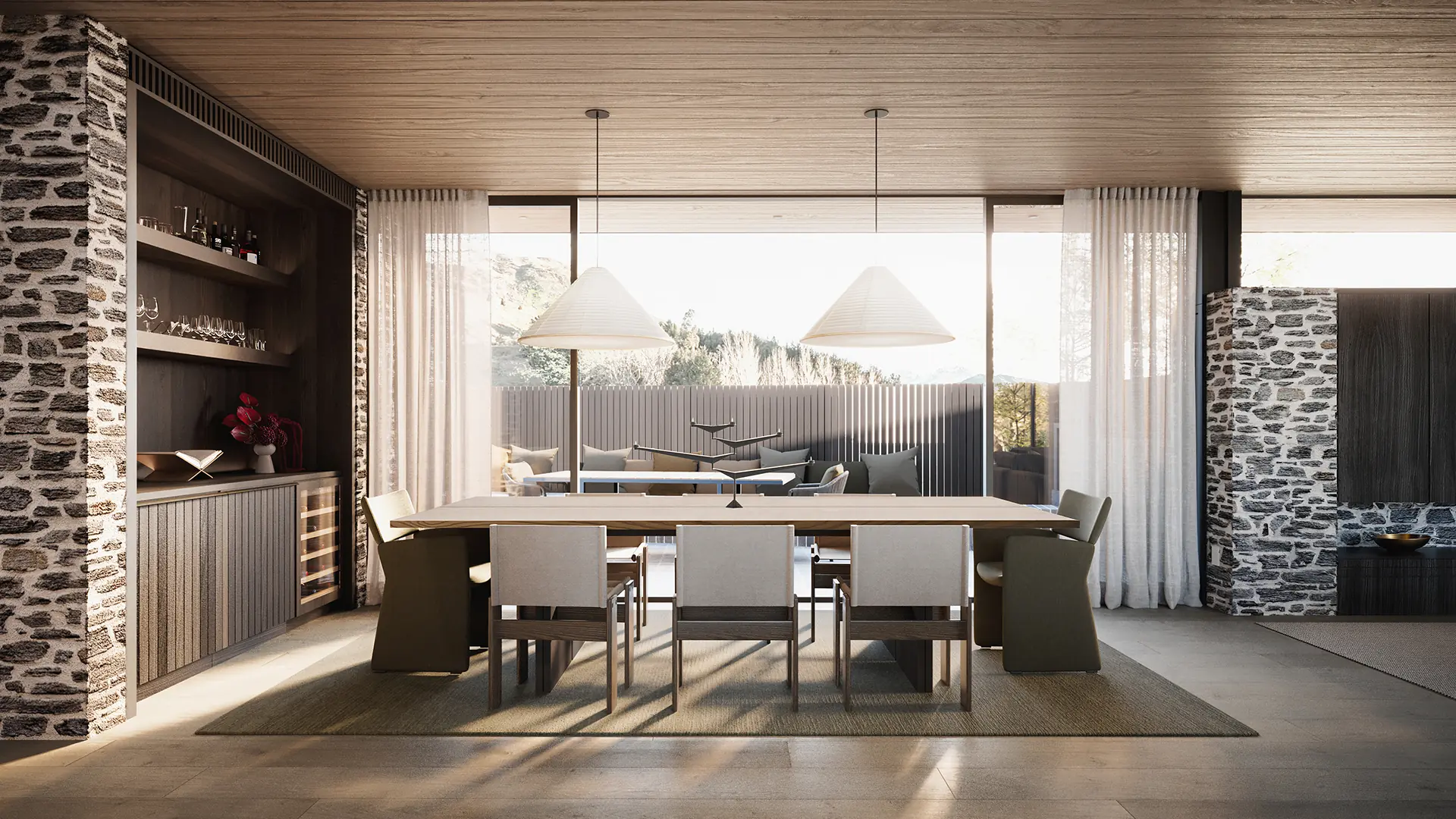 First Light is named for what you see when you wake up here. It sits at the front of Kawarau Heights on one of the estate's largest and most privately positioned sites, oriented to catch the morning across the basin before the valley fully wakes. The flat roof profile keeps the residence settled in the landscape. The full-width glazing makes the mountains part of the room.