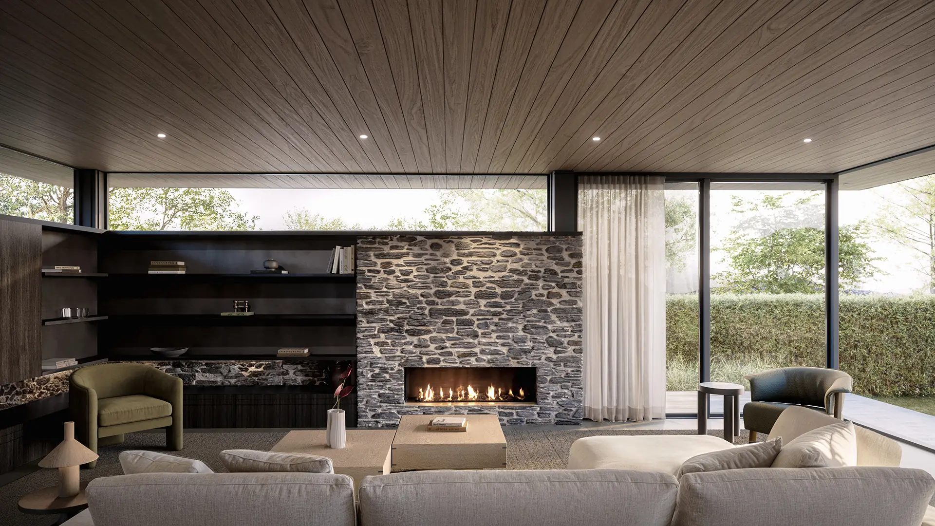 Fireplace: Escea DS1650 single-sided frameless linear gas fire, logs fuel bed, linear trim kit, to main living pavilion