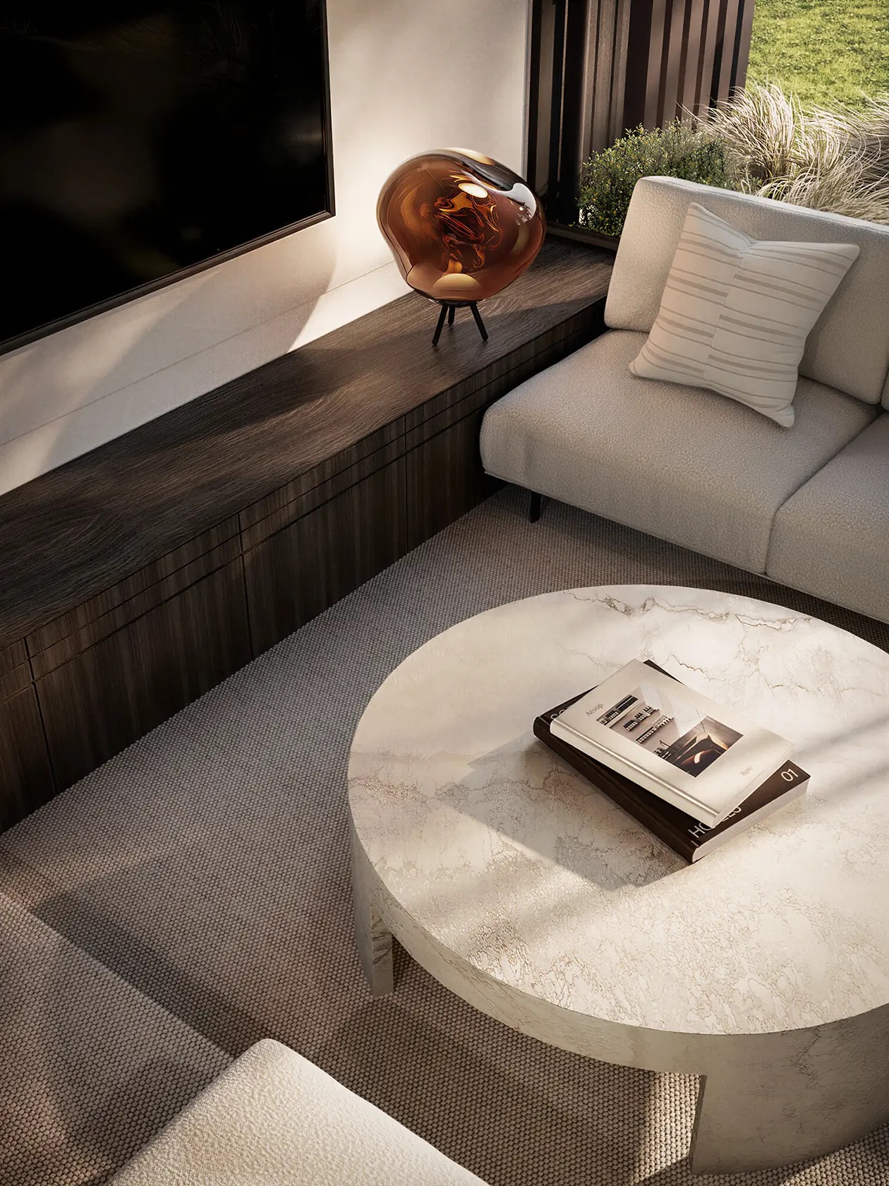 Four bedrooms, four bathrooms, and a powder room. The layout makes sense the moment you see it. Open-plan living, dining, and kitchen sit at one end of the residence, connecting directly to the outdoor terraces through full-width glazing. A sun nook sits off the kitchen, a quieter place to have a coffee when the main living areas are in use.