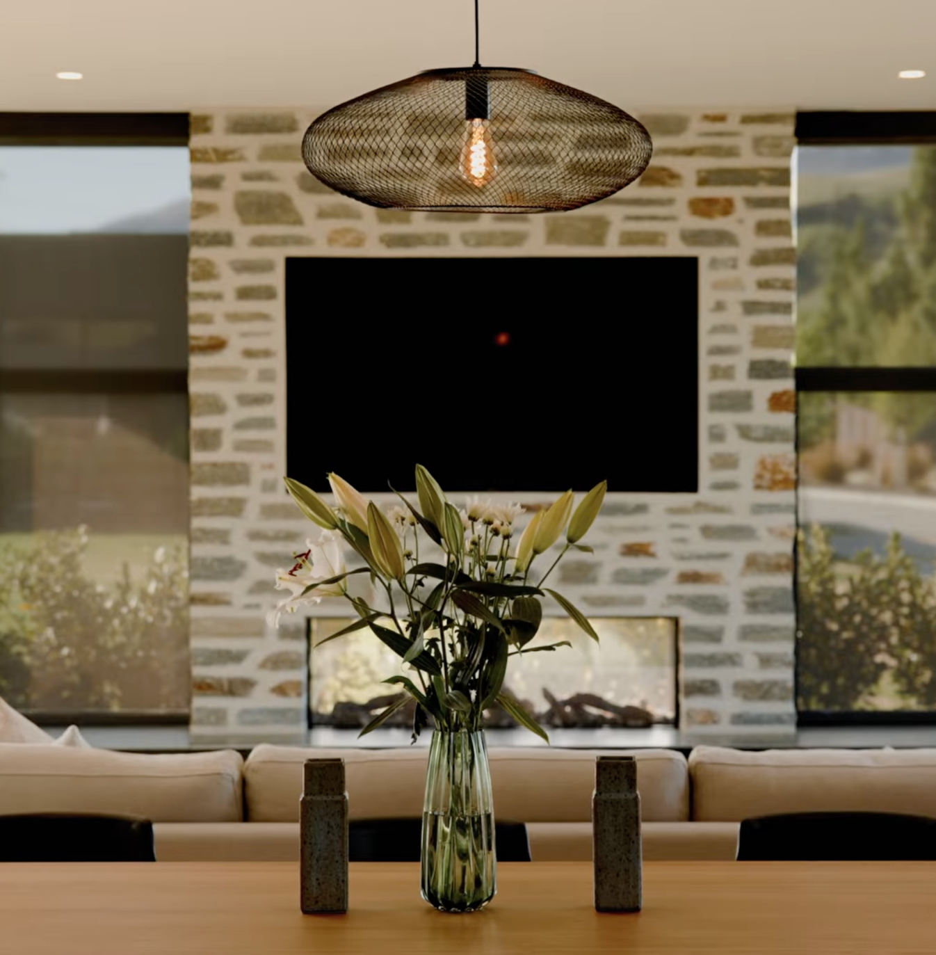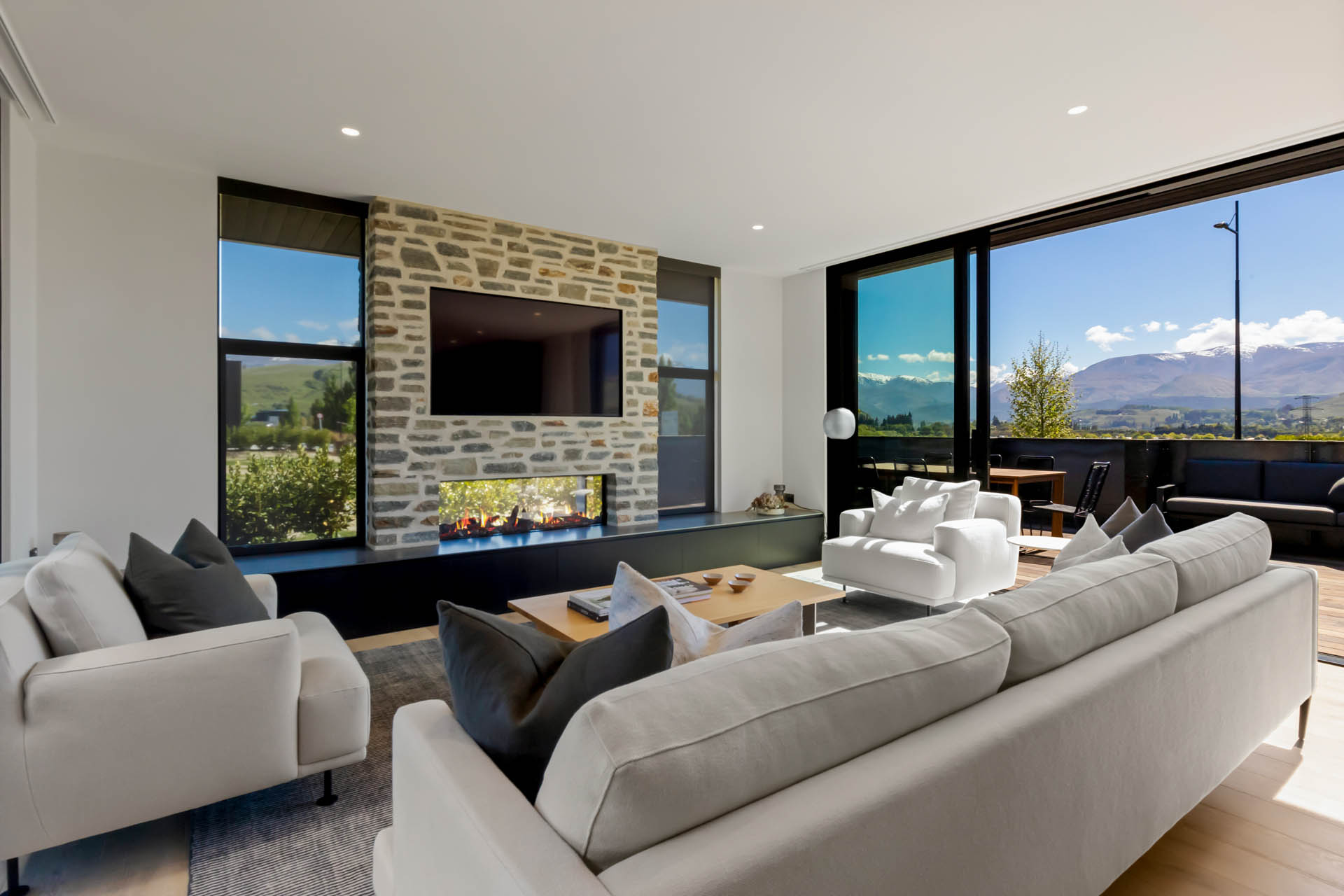 This newly completed, contemporary home offers exceptional style and comfort with its sleek exterior lines, cedar and Central Otago stone cladding, and bespoke interior finishes. It combines bright, open spaces with impressive 2.7m stud height ceilings and floor-to-ceiling glazing that showcase panoramic mountain views and flood the home with natural light.