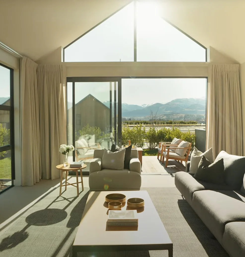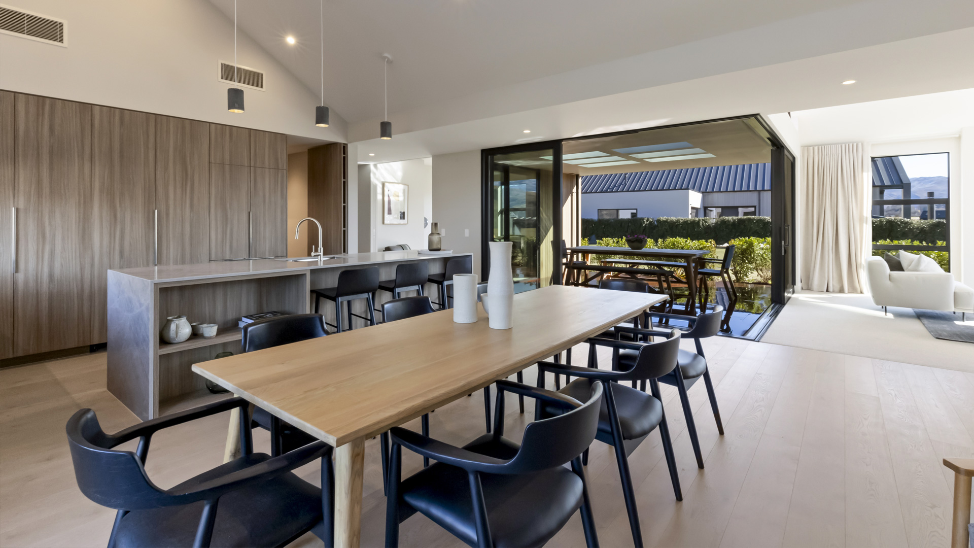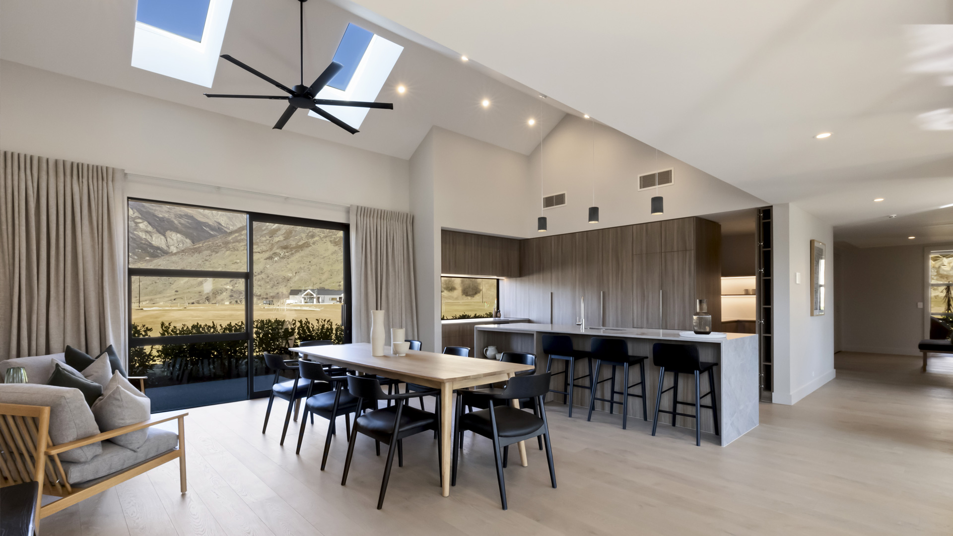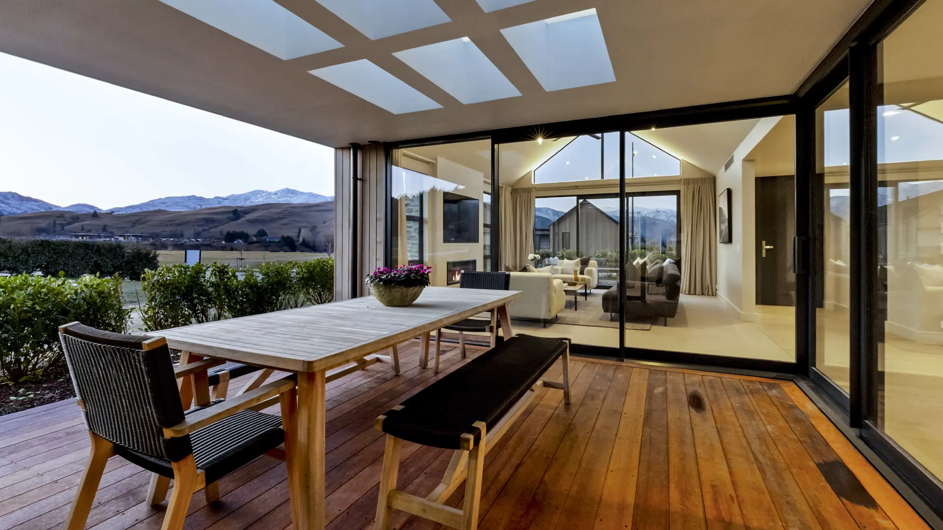 Upon entry, expansive windows capture sweeping views of the Coronet Peak ski field and the snow-capped mountain ranges that wrap around you. This home reflects amazing natural light with its high-pitched ceiling and skylights above, fostering an effortless connection to two inviting outdoor living spaces.