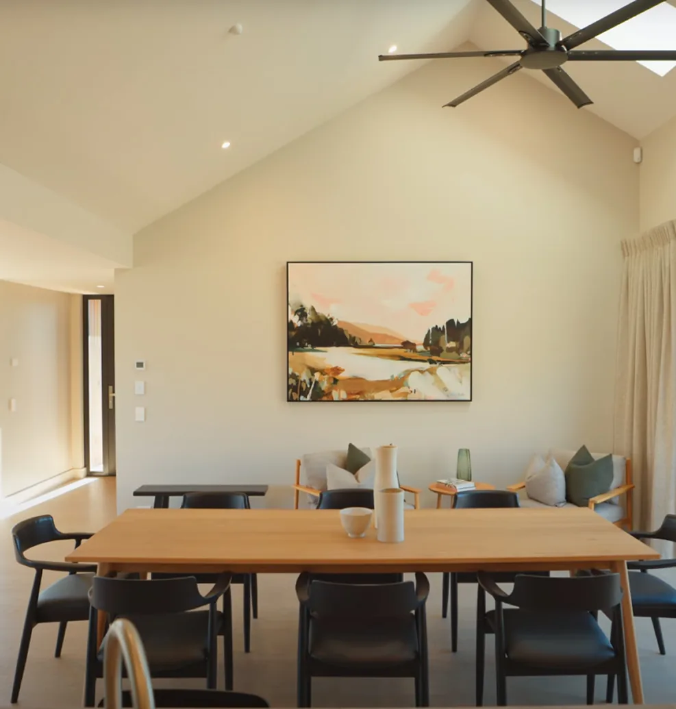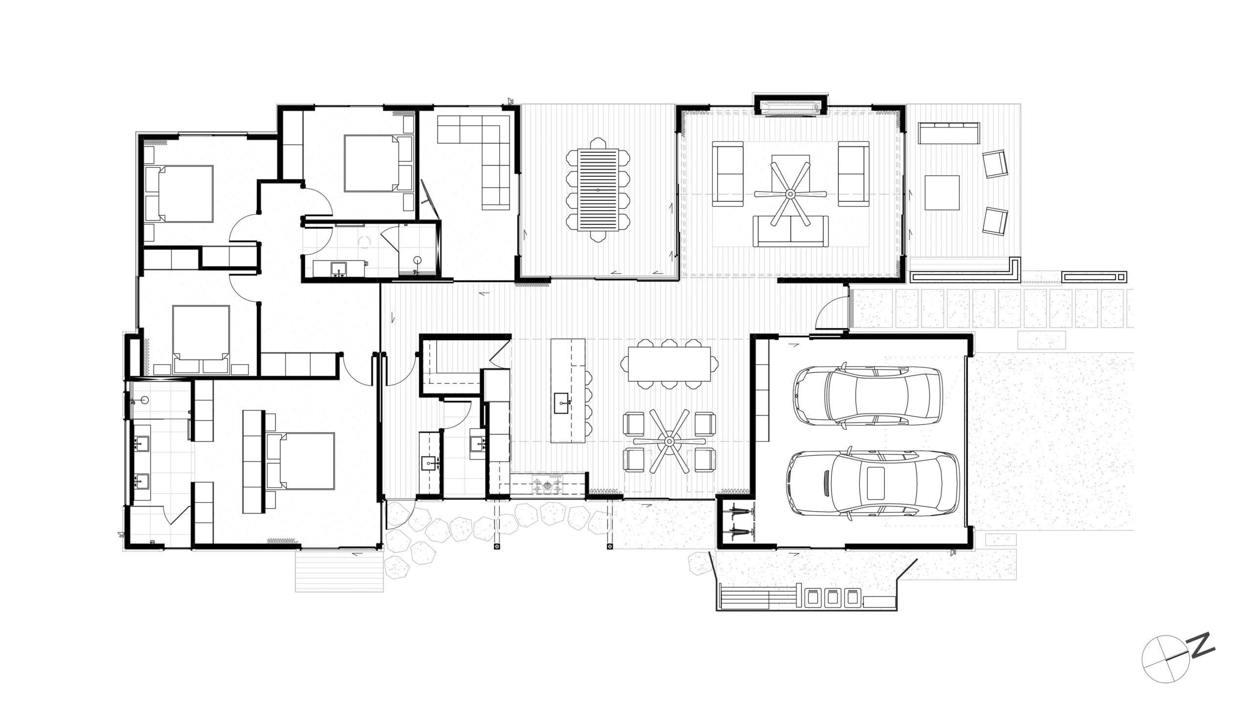 This double pavilion residence, elegantly clad in cedar and metal tray, exemplifies contemporary design with its clean lines and sophisticated material palette. The heart of the home is the expansive open plan living area, designed for seamless indoor-outdoor flow, leading to a covered living space perfect for year-round entertaining. A separate media room offers a private retreat away from the main living areas.